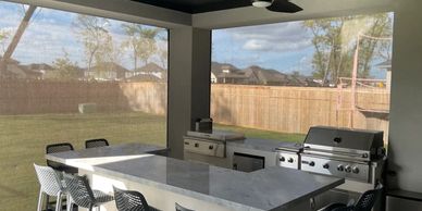 Motorized shades can be installed around outdoor kitchens or dining spaces to create a cozy, private area that shields against wind, insects, and sun.