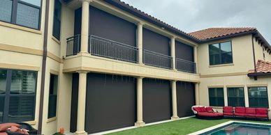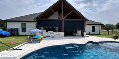 Motorized shades provide privacy, sun, and insect protection, creating a comfortable, weather-resistant outdoor space.