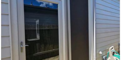 Motorized shades installed on windows and doors are ready for use at the push of a button with a remote control.